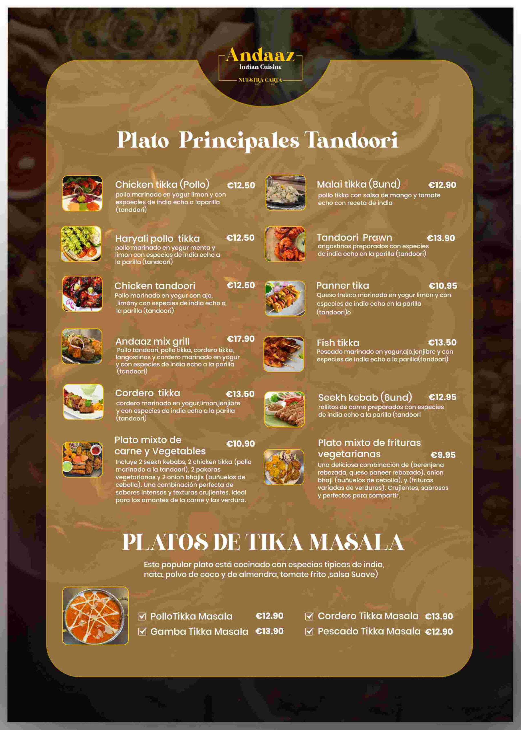 Enjoy our Tandoori main courses, featuring tender chicken marinated in aromatic spices and cooked in a traditional clay oven, juicy seekh kebabs bursting with smoky flavor, flavorful tandoori fish infused with herbs and lemon, and perfectly grilled paneer tikka for a rich vegetarian delight.