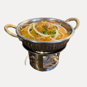 Un sabroso plato de picante medio y cocinado con cebolla frita, ajo, cilantro y jengibre